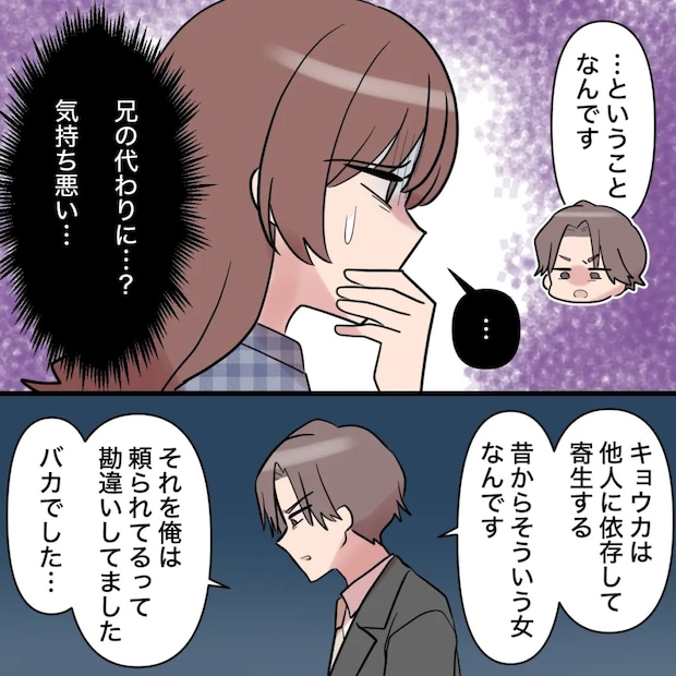 「・・ということなんです」ナオキさんから経緯を聞き「兄の代わりに・・?気持ち悪い・・」と言葉が出ない私。「キョウカは他人に依存して寄生する。昔からそういう女なんです。それを俺は頼られてるって勘違いしてました。バカでした・・」反省しながらそう話すナオキさんは、