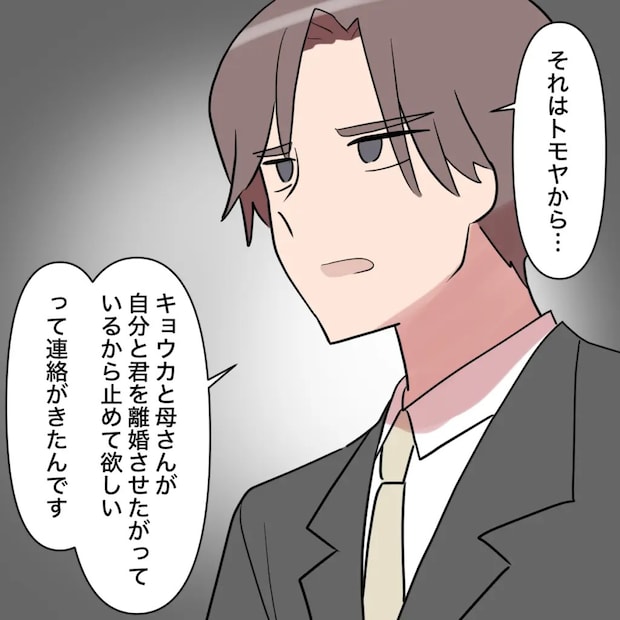 「それはトモヤから・・キョウカと母さんが自分と君を離婚させたがっているから止めて欲しい、って連絡がきたからなんです」ナオキさんが静かに言いました。