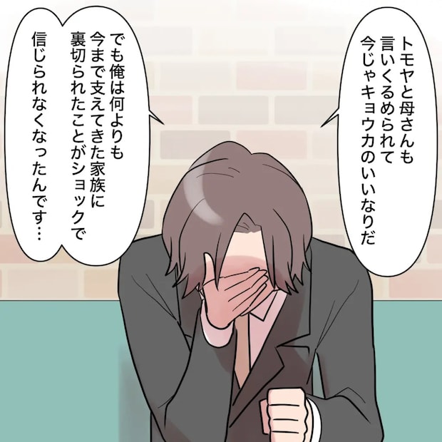 「トモヤと母さんも言いくるめられて、今じゃキョウカのいいなりだ。でも俺は、何よりも今まで支えてきた家族に裏切られたことがショックで信じられなくなったんです・・」下を向き、顔を手で押さえながらナオキさんがそう言いました。