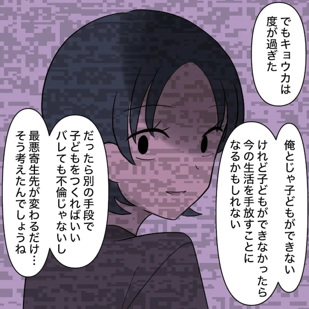 「でもキョウカは度が過ぎた。俺とじゃ子どもができない。けれど子どもができなかったら今の生活を手放すことになるかもしれない。だったら別の手段で子どもをつくればいい。バレても不倫じゃないし、最悪寄生先が変わるだけ・・そう考えたんでしょうね」キョウカさんの本性から何を考えているのかを予想しました。