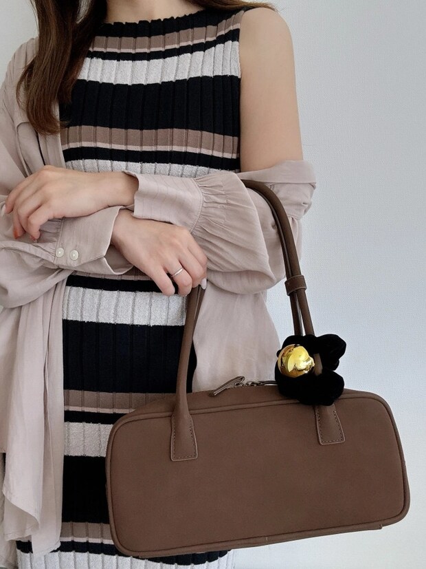 こちらは、ボーダーワンピに薄手のシャツを羽織った、@aya_____76さんのコーデです。ワイドボストンバッグは、2025年のトレンドカラーであるブラウンをチョイス。ワンピースのボーダーにもブラウンが配色されているので、コーデに統一感が生まれています。ワイドボストンバッグはサイドポケットなどがないシンプルなデザインなので、シュシュやチャーム、スカーフなどでデコるのもアリ♡