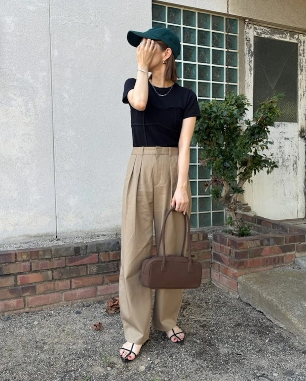 こちらは、シンプルなブラックのTシャツにベージュのチノパンを合わせた@say011さんのコーデ。半袖Tシャツ・サンダルという夏にもぴったりなアイテムはそのままに、秋っぽさのあるブラウンのワイドボストンを取り入れるだけで、季節感のあるコーデに大変身します。
