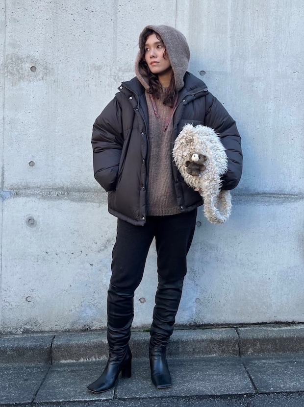 ブラウントーンのクールなスタイリングに映える、もこもことした大きめバッグがアクセント! レザーブーツとのコントラストがコーデに奥行きを与えてくれます。
