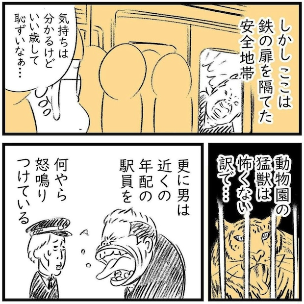 怖そうな顔つきの男性が駅のホームに取り残されており、怒りにまかせて電車の扉を激しく叩いていました。さらに、その男性は駅員にも大声で怒鳴っていました。