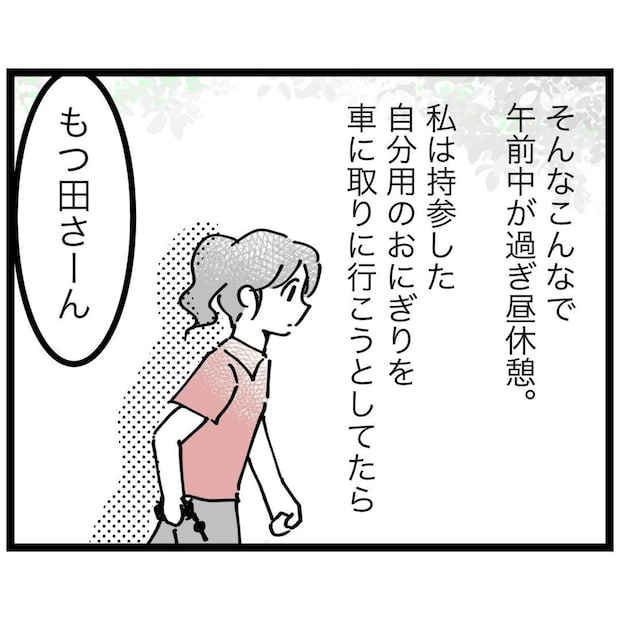 苦手な給水係の仕事を終え、お昼休憩の時間になりました。持参したおにぎりを車に取りに向かうもっつんさんに、リーダーから声がかかります。