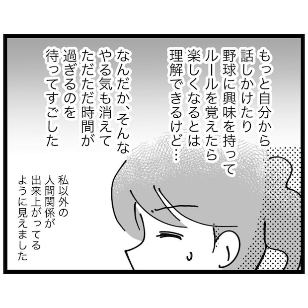 ゴールデンウィークの練習試合。話す相手も見つからず、ひとりポツンと座っていたもっつんさんは、場違いな空気を感じていました。すでにできあがっている親同士の人間関係、そしてよくわからない野球のルール。その輪に入っていけない自分に、ますます居心地の悪さが募っていきます。