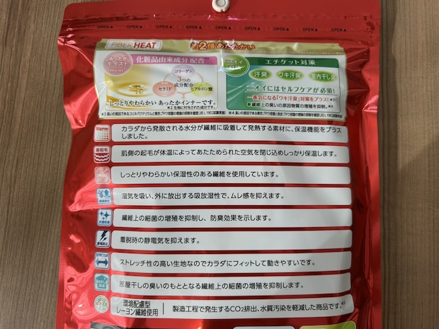 吸湿発熱機能があり、体から出る湿気などの水分を吸収して発熱し、その暖かさをキープしてくれます。