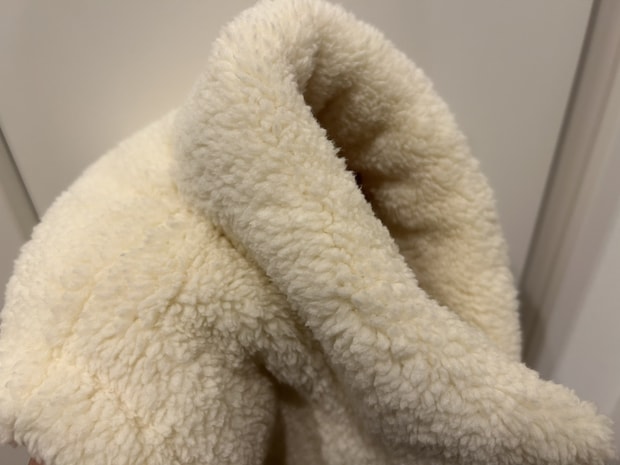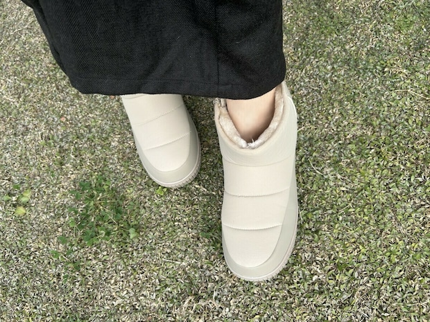 表面はつるんとした生地、裏地はフェルトのようなあたたかみのある素材で、腰部分にはさらにもこもこのボア生地が重ねられているのが特徴的。