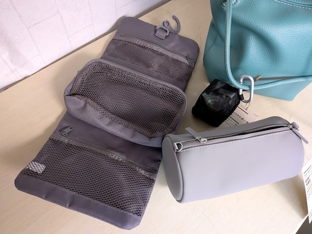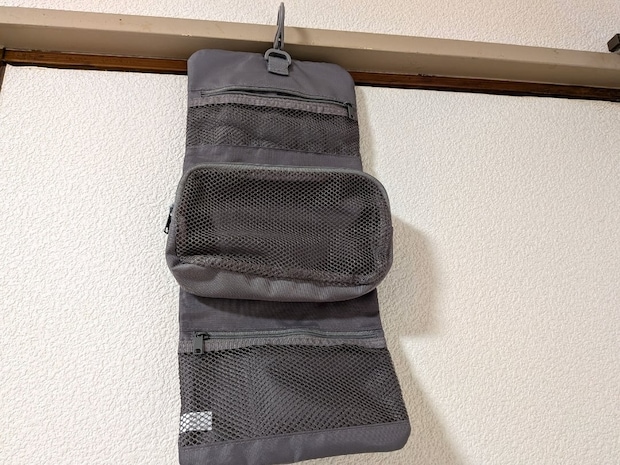 真ん中部分のポーチは、取り外しが可能。家でも旅行でも共通して使うものをここに入れておくと、外してそのまま旅行へ持っていけたり、丸ごと持って行って、洗面台付近に吊るしておけたりと便利です!