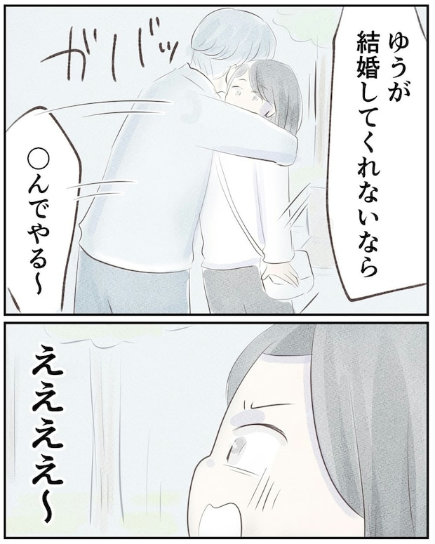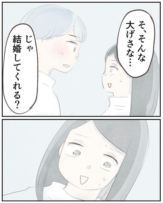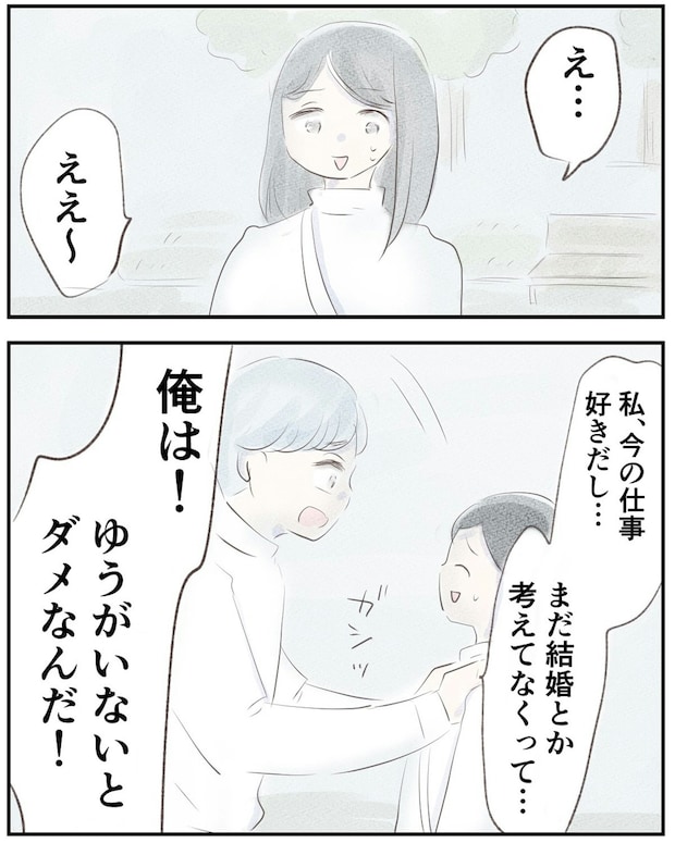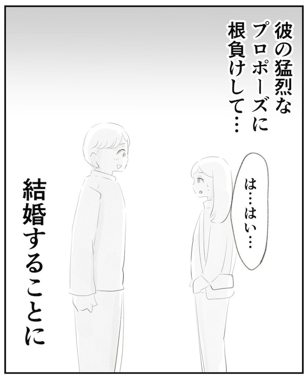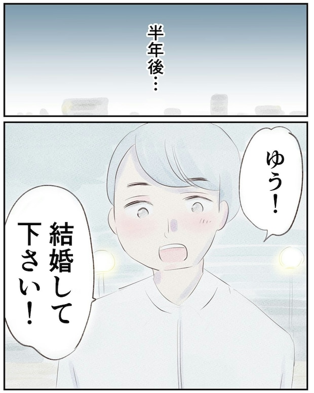 タロウから宗教の話を聞いた半年後、彼から突然プロポーズされます。このとき結婚する気持ちのなかったゆうさんは返事に困っていました。しかし、タロウの勢いに押されゆうさんは結婚を承諾します。