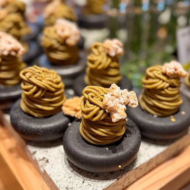 「苺とピスタチオのモンブラン」です。上にはサクサクのクランブル、その周りはピスタチオクリームがいっぱい。カットしてみると、フレッシュないちごとソースが。