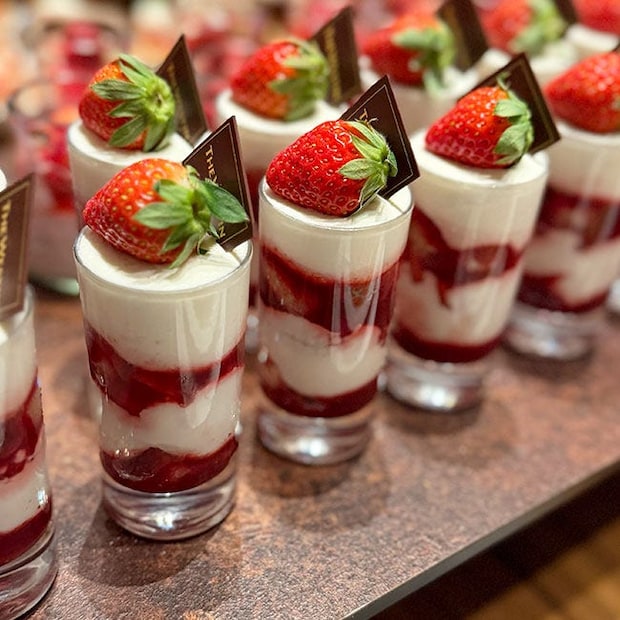 「苺とマスカルポーネクリームのトライフル」は、思わずうっとりしてしまうほどの美しさ。いちごのムース、マスカルポーネクリーム、生のいちごのまとまりがよく、全体的に爽やかなテイスト。いちごのおいしさが引き立てられています。