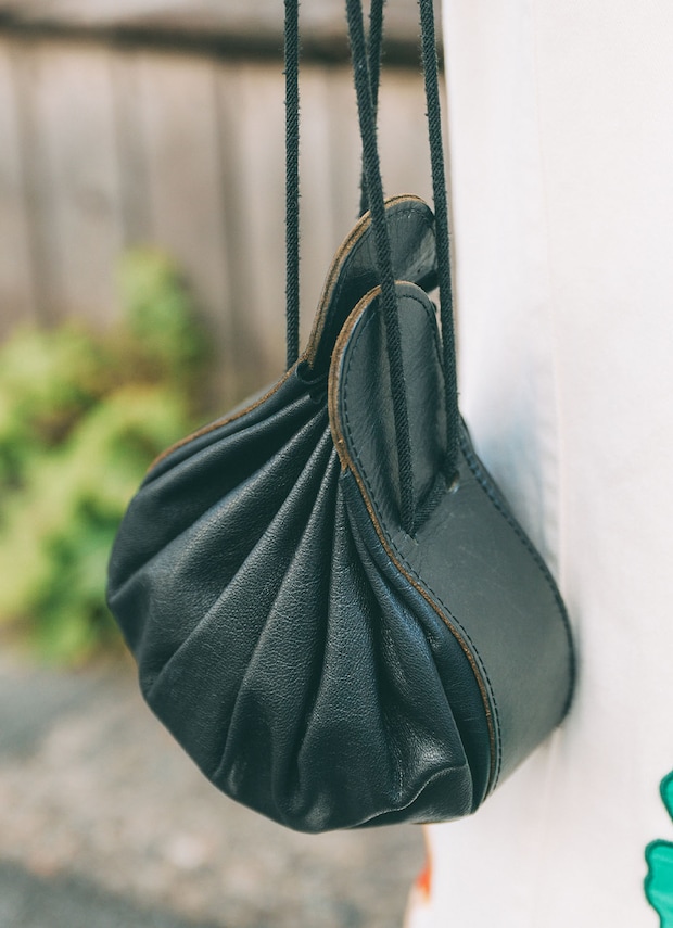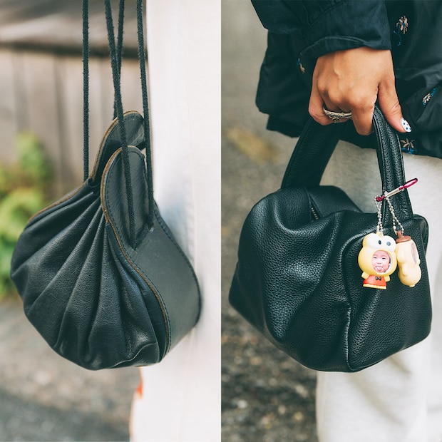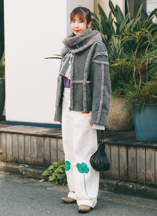 ボリュームたっぷりなふわもこのスエードアウターを主役に、白のパンツでクリーンにまとめたsakiさん。コロンとしたフォルムがユニークなレザーバッグは、『オッドナンバーズ』で見つけたもの。四葉のクローバーがあしらわれたパンツや、遊び心のあるバッグなど、目を引くディテールワークでコーデをランクアップさせた上級者な着こなし。