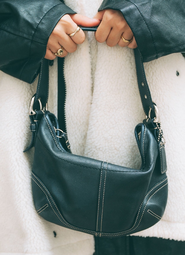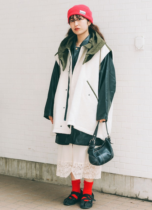 レザー・ボア・レースの異素材をミックスした軽やかなモノトーンコーデが素敵なみやびさん。ニット帽とソックスを赤でリンクさせた今どきな着こなしが光る。手元には、やわらかなレザーが魅力の『コーチ』のバッグを携えて、すっきりと大人っぽくまとめて。大きすぎず小さすぎない絶妙なサイズ感で、きちんと感と使いやすさを両立。