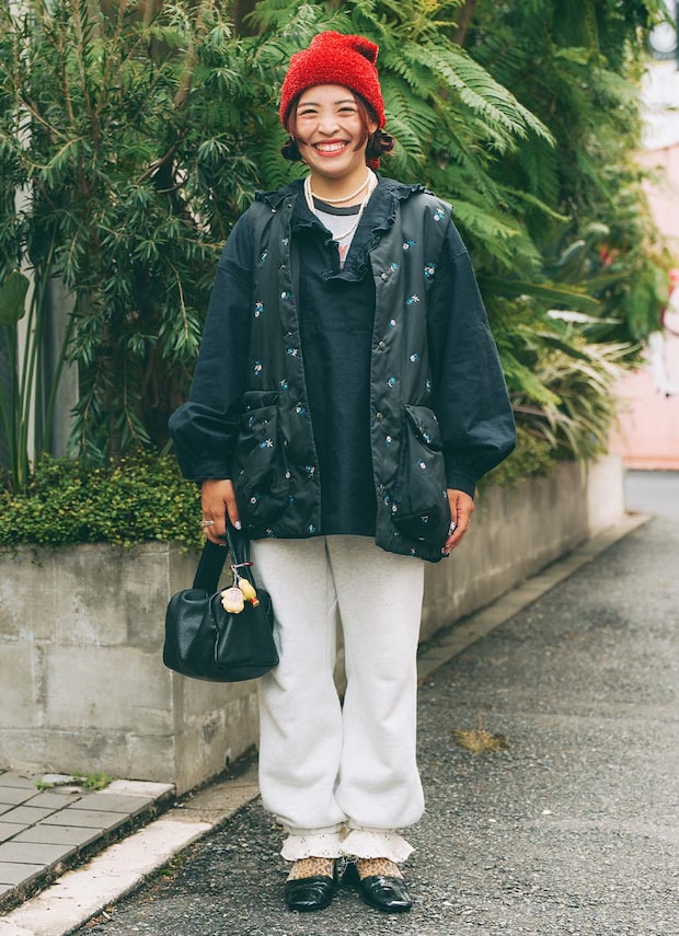 シボ感が大人っぽいボックス型バッグを愛用中のルミさん。可憐な花柄のアウターに、レースのフリルパンツやパールのネックレスを合わせて、ラブリーなムードに。そこに、真っ赤なニット帽やレオパード柄のソックスで遊び心もプラス。大人っぽくも茶目っ気たっぷりなバランスがお見事! バッグについたキッチュなチャームも微笑ましいポイント♡
