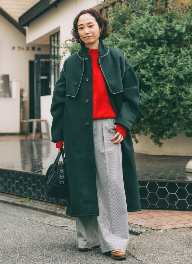 ロングコートをさらりと羽織り、華やかな赤のニットトップスを差し色として忍ばせた上條裕美子さん。手元に合わせたのは、しっとりとしたベロア素材がリュクスなムードを添える『ビューティフルピープル』のスクエアバッグ。モダンな装いに上質な素材感が映え、大人の余裕を感じさせる洗練スタイルが完成。