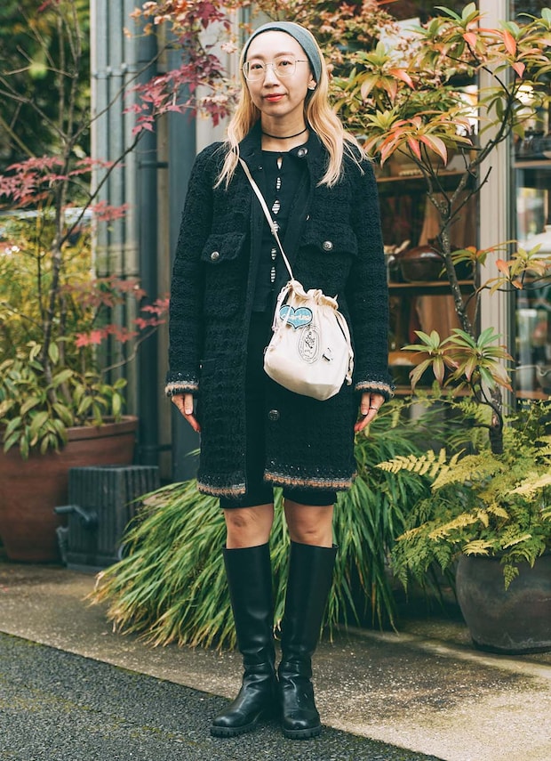 ツイードコートを主役に、ハーフパンツ×ロングブーツでトレンド感のある着こなしが印象的。ワントーンのブラックコーデながら、異素材をミックスすることで奥行きのあるスタイルに。頭にはグレーのヘアバンドを添えて、ワントーンにさりげないこなれ感をプラス。ブーツからのぞくヘルシーな素足が重くなりがちな冬コーデをぐっと軽やかに。