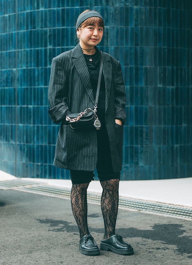 1枚でサマになるストライプ柄のジャコットを羽織って、マニッシュにまとめたみおさん。ボトムはカプリパンツ×レースタイツで、エッジを効かせた今っぽいレイヤードが素敵。ヘアは、ロウシニヨンにグレーのヘアバンドを添えて、知的でこなれたムードを演出。存在感のあるピアスで華やかに仕上げた大人マニッシュ。