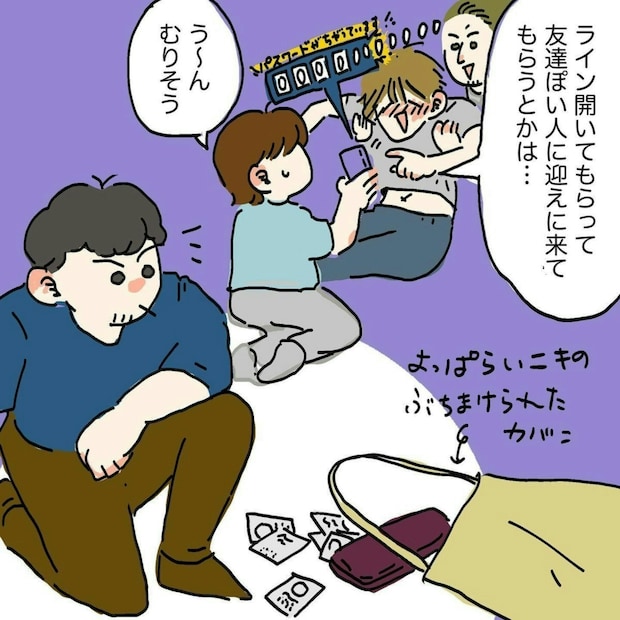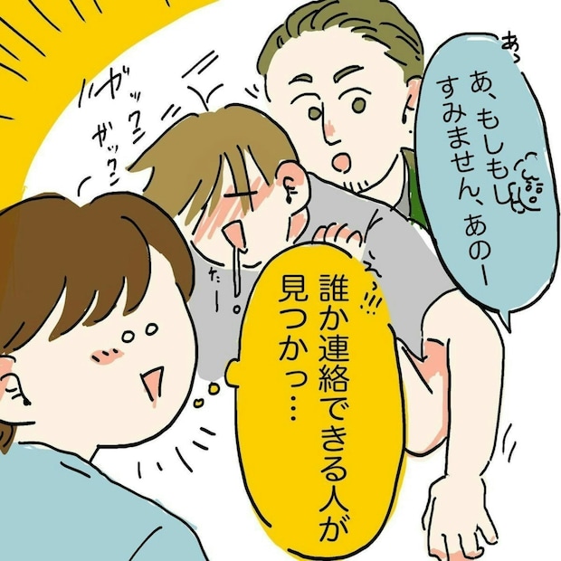 酔っ払った男性をみんなで介抱し、どうにか男性を引き取ってもらえる連絡先が見つからないかと考えるも、うまくいきません。そんな中、お兄さんが男性の名刺を見つけて勤務先だと思われる会社に電話をしましたが、今すぐの解決には至りませんでした。