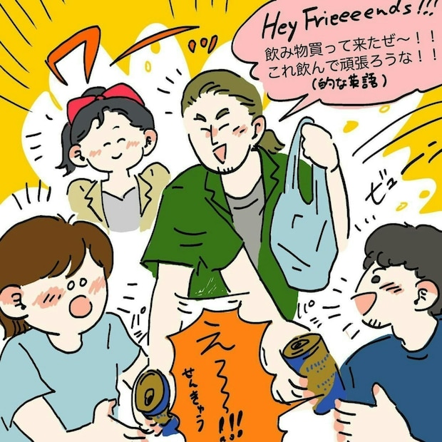 スペイン系の彼がみんなの分の飲み物を買って来てくれ、変貌ちゃん🍞ズボラめエッセイ漫画さんが御礼を言おうとしたところ、手にはビールが!アルコールにはアルコールで対抗しようということなのでしょうか。酔っ払いの介抱をしているときに、ビールを手渡されるとは…この先にもこの後にも無いことでしょう。