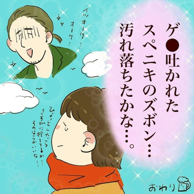 そうこうしているうちに、ケバブ屋さんはお店に戻り、スペイン系の彼も姿が見えなくなりました。その後、スペイン系の彼が戻って来て、その手には何とビールが!みんなで飲んで乗り越えようとのことなのでしょうか?日本人には無い発想に絶句する変貌ちゃん🍞ズボラめエッセイ漫画さんでした。
