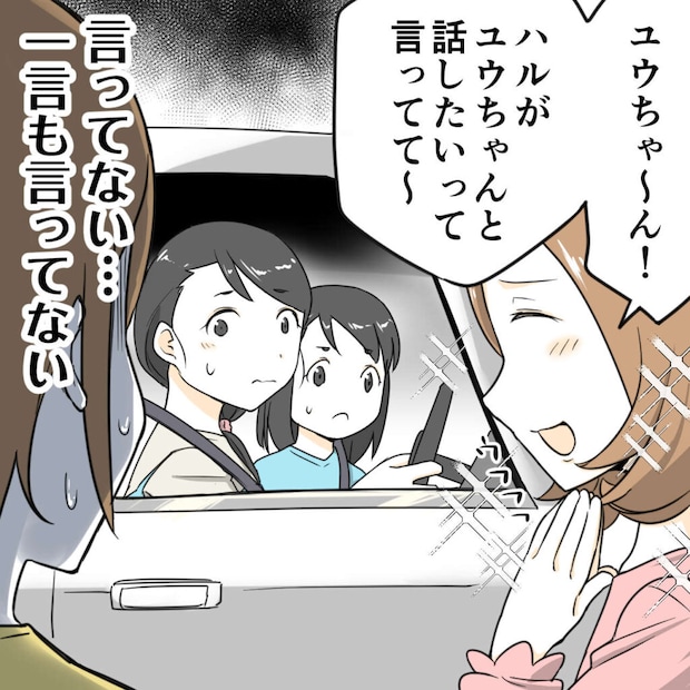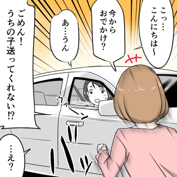 ハルちゃんママと目が合ってしまったユウちゃんママは仕方なく車を停めて窓を開け「こっ・・こんにちは~」と挨拶。すると、ハルちゃんママは素早く車に駆け寄り「今からおでかけ?」と質問。「あ・・うん」と優ちゃんママが答えると、「ごめん!うちの子送ってくれない!?」と言い出しました。えぇ?私が断ったら今度はユウちゃんママ?突然の依頼にユウちゃんママはもちろん「・・え?」と戸惑っています。うんうん、そりゃそうだよね。