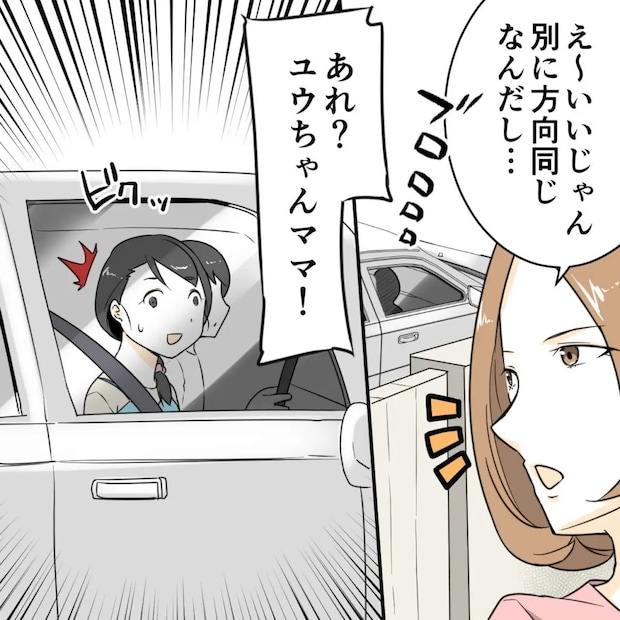 ハルちゃんママは「え~いいじゃん。別に方向同じなんだし・・」とまだブツブツ言っていましたが、ちょうど家の前を1台の車が通りかかると「あれ?ユウちゃんママ!」と運転していたユウちゃんママに目ざとく気づいたハルちゃんママ。