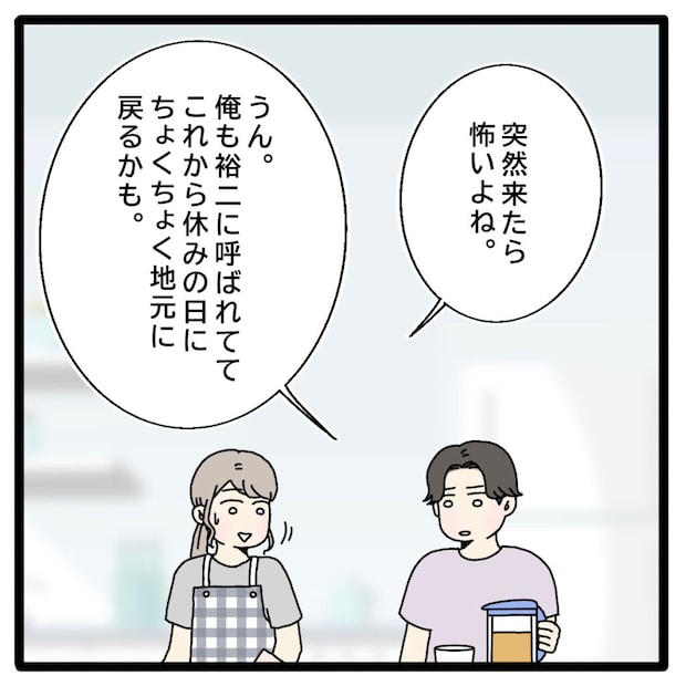 まさか身近でそんな出来事が起きていたとは思わず、私は「大変だったんだ・・・」とつぶやきました。正志は真剣な表情のまま、「もしかしたら元夫が来るかもしれないみたいで、総一郎を中心に地元のみんなでサポートすることになってさ」と静かに続けます。