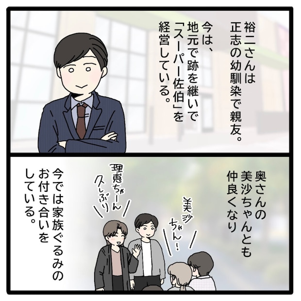 裕二さんは、正志の幼馴染で親友。今は地元で親の後を継いで、若いながらも「スーパー佐伯」を経営しています。私は裕二さんの妻である美沙ちゃんとも仲良くさせてもらっていて、家に招いたり、お出かけしたり・・・家族ぐるみのお付き合いをしています。
