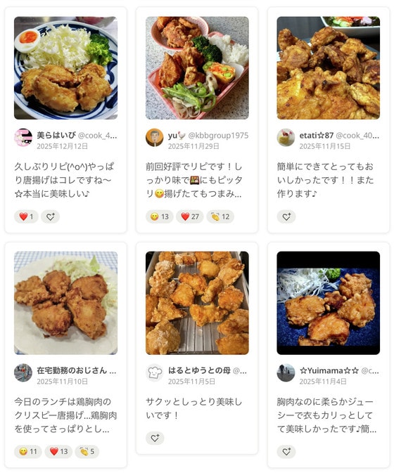 つくれぽ(みんなのつくりましたフォトレポートのこと)でも、「簡単にできておいしい!また作ります」「むね肉なのにやわらかくてジューシー、衣がカリッとしておいしかったです」といった声がたくさん届いています。