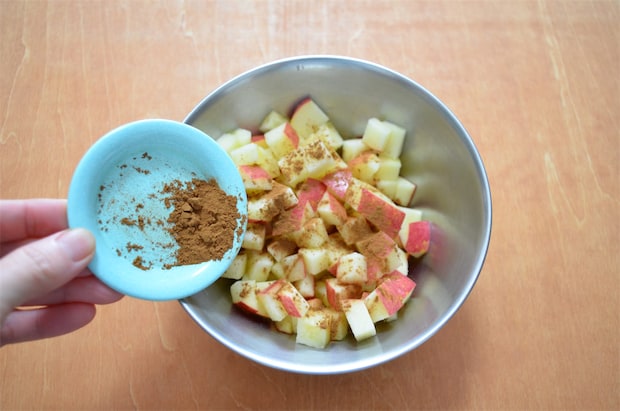 2. りんごは皮つきのまま1cmの角切りにし、シナモンパウダーをまぶす。