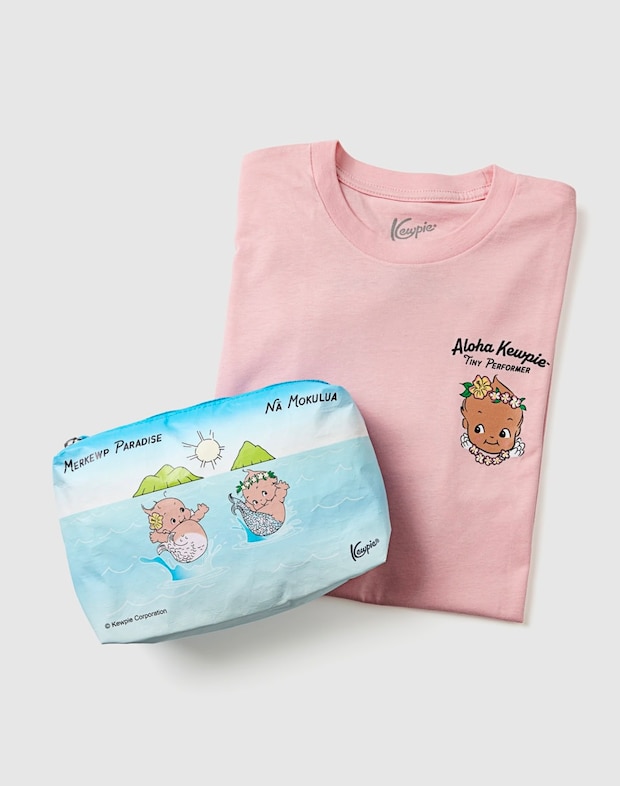 日焼けキューピーのTシャツ$35、ポーチ$12.60(共にMoni Honoluluにて販売)