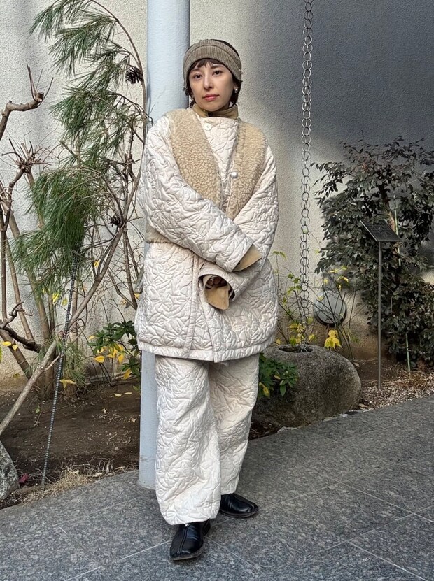 「コートにボアベストを重ねた、少しクセのある着こなしをワントーンでまとめたところがポイントです。軽くて暖かいボアベストは、装うアクセサリーのような感覚で取り入れています。素材の重なりを楽しみつつ色味を抑えることで、スタイリングに静かな強さを持たせています」