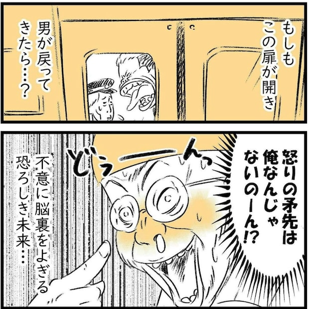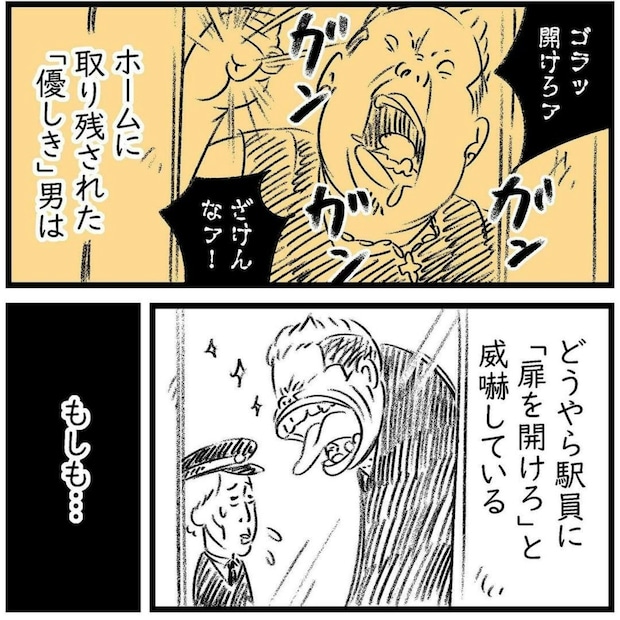 そのとき、ホームには強面の男性が取り残されてしまい、怒りにまかせてドアを激しく叩き始めました。さらに、駅員に向かってドアを開けるように威嚇する様子も見せます。その姿を見たトンさんは、「もしこの男性が車内に戻ってきたら、自分に怒りが向けられるのではないか」と不安でたまりませんでした。