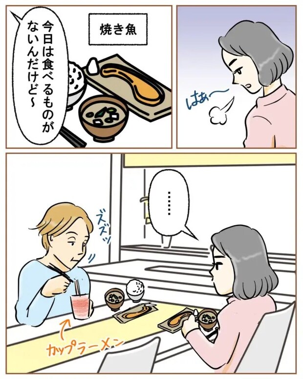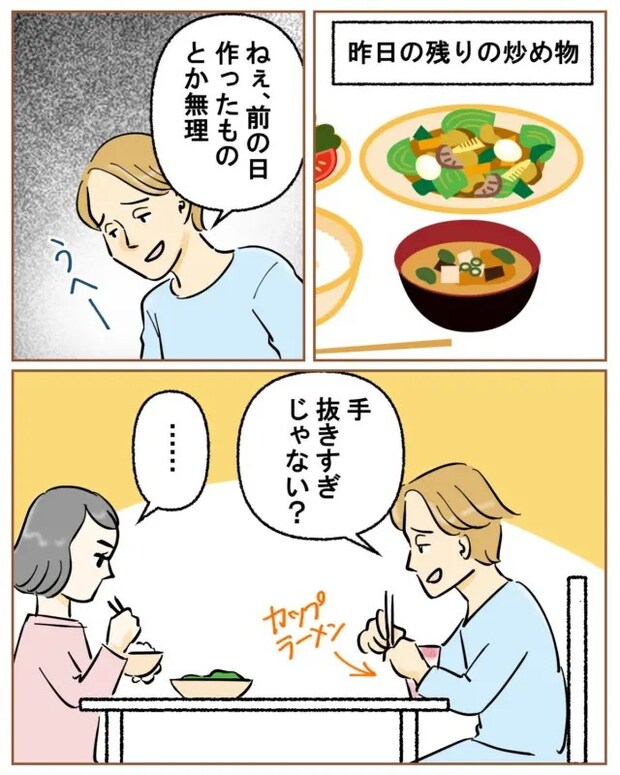 さらにある日のメニューで残ったおかずを出そうものなら「前の日作ったものとか無理」と言う夫に、「手、抜きすぎじゃない?」と言われ、またカップラーメンに手を出すのです。