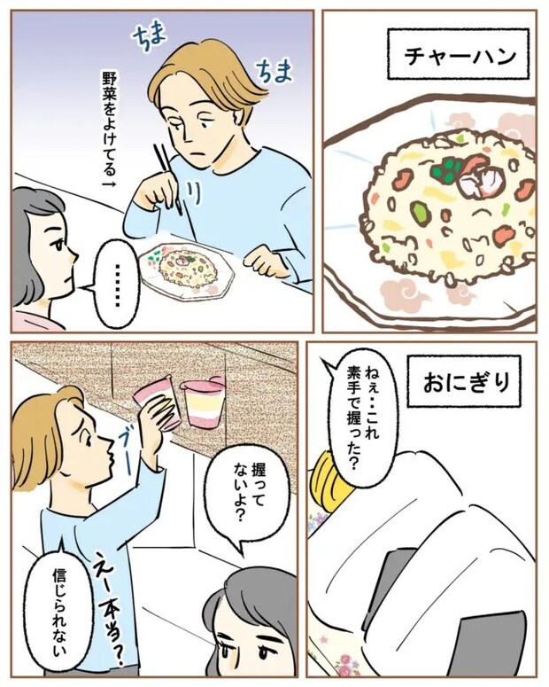さらに、他人が素手で握ったおにぎりに抵抗があり、必ず確認してくるところも嫌い。素手で握っていないと言っているのに、夫が選ぶのはカップラーメンなのでした。