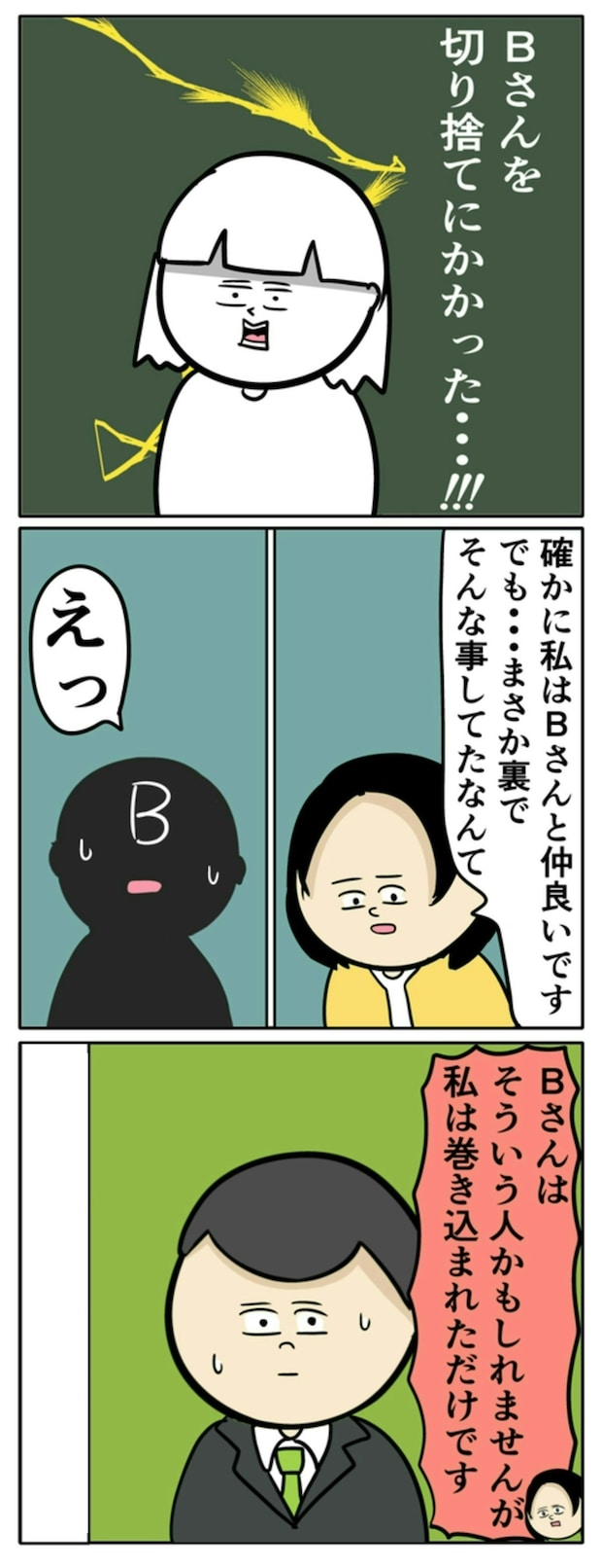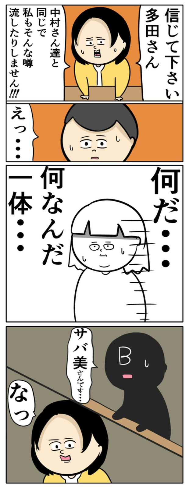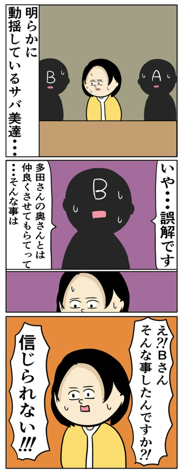 サバ美には、AとBの2人の協力者がいます。全員が会議室にそろいました。それでも、話は平行線のまま。そこに多田さんがあらわれて「妻がBさんから不倫を疑うようなことを言われたり、他のママ友に悪口を言っていると聞かされたりした」と有力な証言をします。