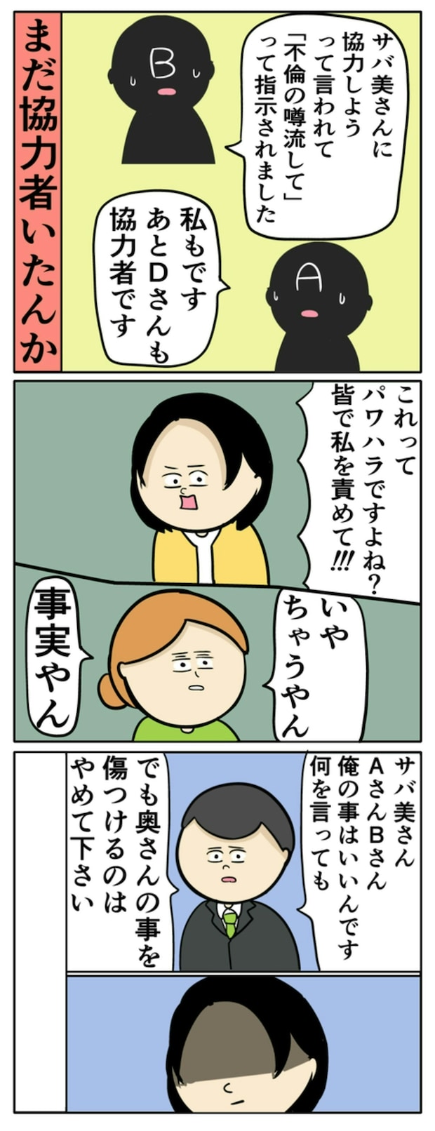 主人公・岡田さんは突然、同じ島の中村さん・富田さん・藤田さんとともに呼び出しされ、「サバ美がパワハラ被害を訴えている」と言われたのです。全力で否定しますが、両者の言い分は食い違います。そこで、双方を交えた話し合いが行われることに。