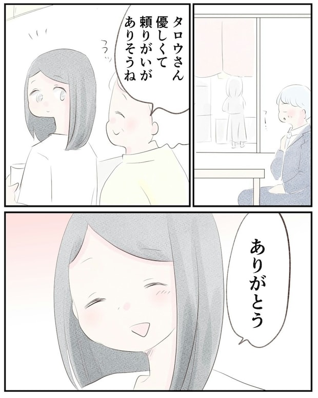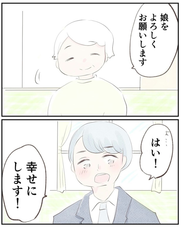ゆうさんの母親に結婚のあいさつをするタロウは少し緊張気味です。「優しくて頼りがいがある」という母親の言葉を聞いて、ゆうさんは笑顔になりました。