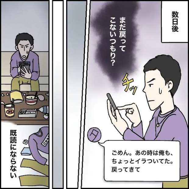 それから数日後、「まだ戻ってこないつもり?」とモヤモヤが募るタカシさんは、「ごめん。あの時は俺もちょっとイラついてた。戻って来て」とメッセージを送ったものの、既読になりません。