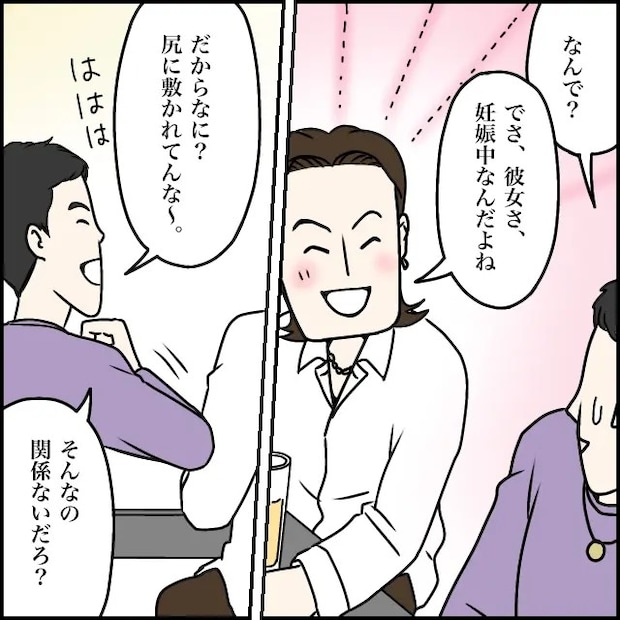 「なんで?」とたずねるも、その声を遮って「でさ、彼女さ、妊娠中なんだよね」頬を赤くして照れながら話すアツヤさんに、「ははは!だからなに?尻に敷かれてんな~。そんなの関係ないだろ?」タカシさんは、まるでアツヤさんが冗談を言っているかのように振る舞うのでした。