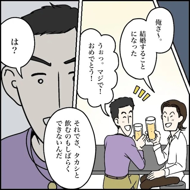 「俺さ~。結婚することになった」と話すアツヤさんに、「うぉっ。マジで!おめでとう!」タカシさんがお祝いの言葉を伝えると、「それでさ、タカシと飲むのもしばらくできないんだ」アツヤさんにサラリとそう言われ、「は?」と真顔になるタカシさんが、