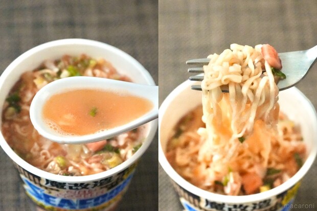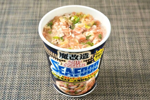 魚介の風味が効いた、おなじみの「カップヌードルシーフード」のスープと明太子は言うまでもなく相性抜群。