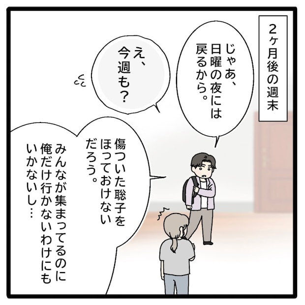 聡子さんをサポートするために、休日を利用して正志が地元へ帰るようになってから2ヶ月が経ちました。「じゃあ、日曜の夜には戻るから」泊まりの用意を詰め込んだリュックを背負いながら、正志は今週もそう言います。「え、今週も?」驚いたように尋ねると、正志は難しい顔をして「傷ついた聡子を放っておけないだろう、みんなが集まっているのに俺だけ行かないわけにもいかないし・・・」と応えました。