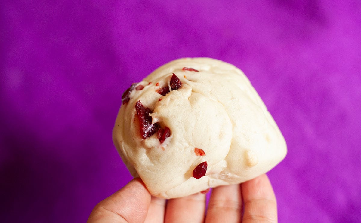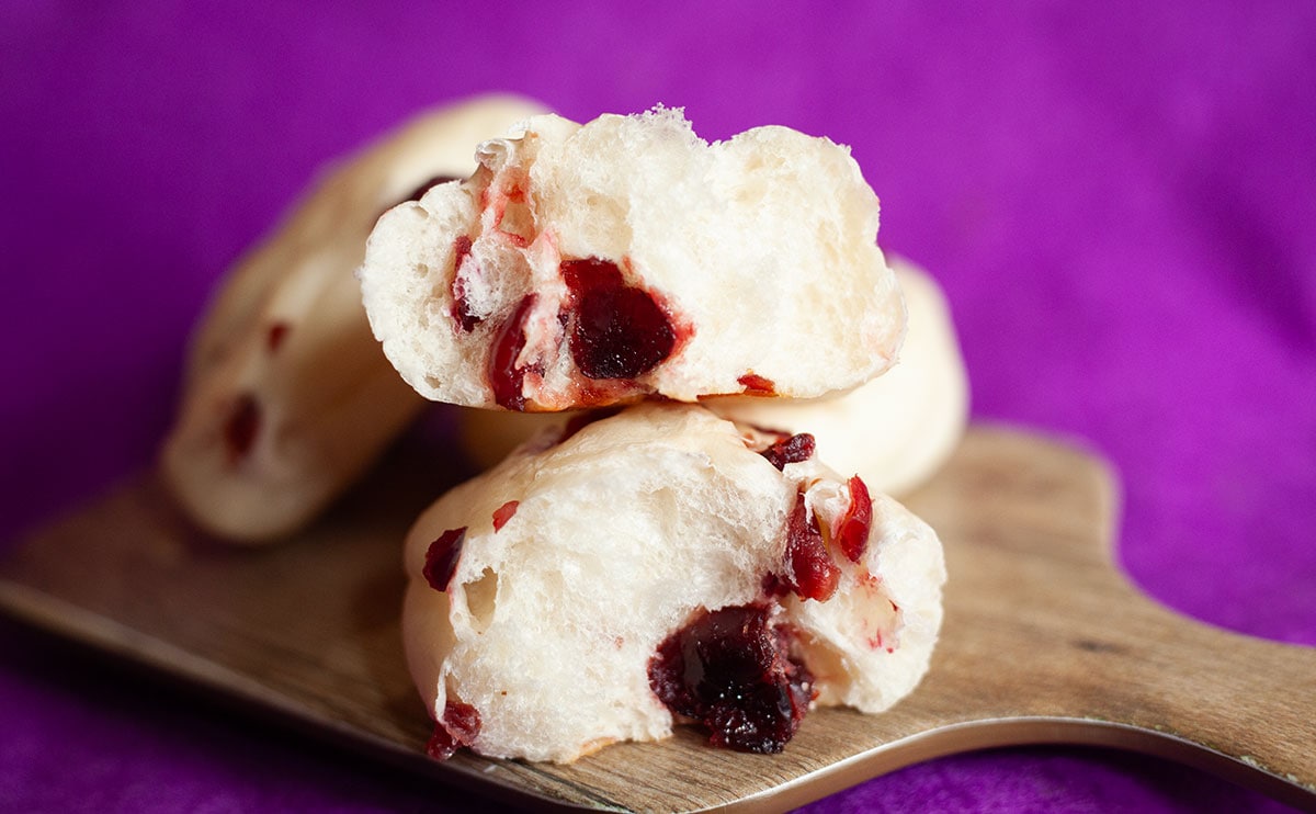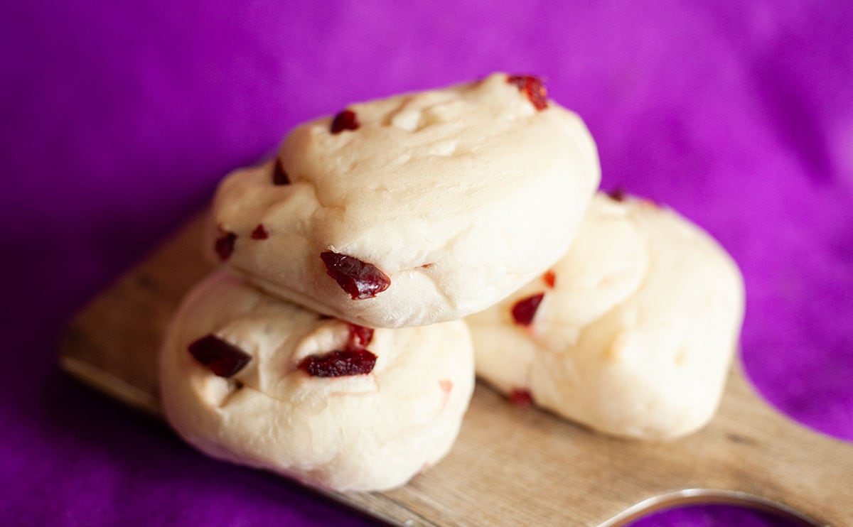 白パンにクランベリーが練り込んでありだけのシンプルな一品です。白い生地だと、クランベリーの赤が映えますよね。