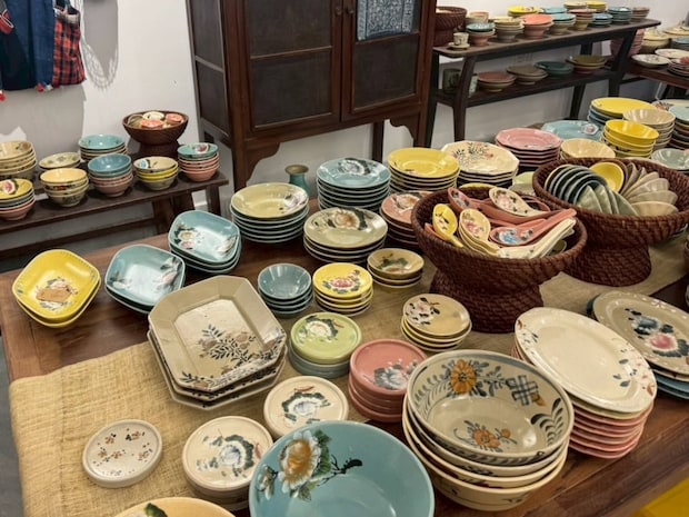 ホーチミンの陶器、「ソンべ焼き」は水色、ピンク、黄色、ベージュ。カラフルなのに柔らかくて、手描きの花や葉っぱがどれもかわいい。絵柄も形も少しずつ違って、揃っていないところが、むしろよかった。
