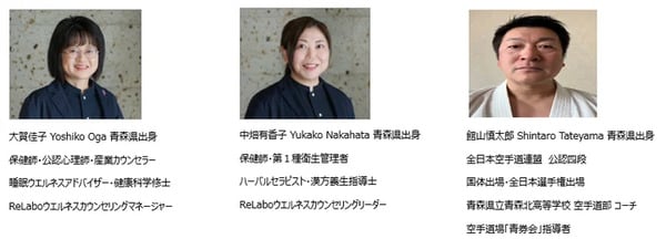 ReLabo執行役員でソムリエの江渡大さん、柔道整復師・温泉ソムリエマスター・温泉健康指導士の佐々木達也さん、青森県花であるリンゴの花のアーティフィシャルフラワーを商品開発した中山陽子さん、
