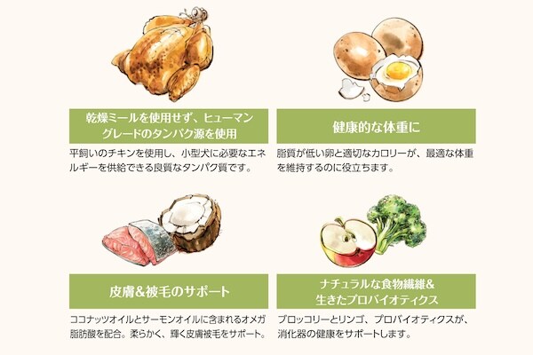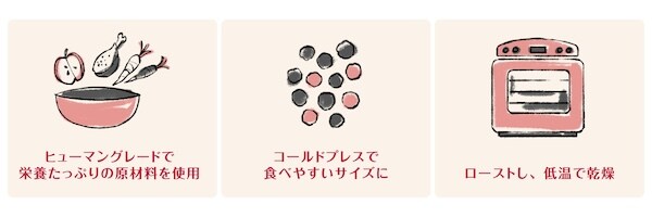ヒューマングレードの自然素材を「コールドプレス製法」することで、素材本来の栄養価を損なわず、美味しさもそのまま。さらに「ロースト調理&低速乾燥(スロークッキング)」で旨みをしっかり閉じ込めている。