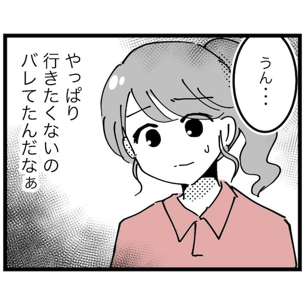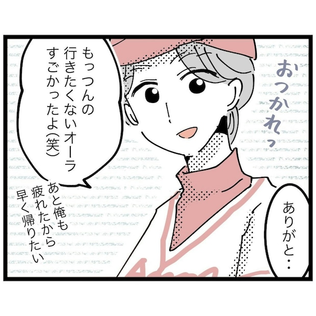 夫の助け舟で、打ち上げには行かないことになりました。「行きたくないオーラ」が出てしまっていたことに、もっつんさんは複雑そう。