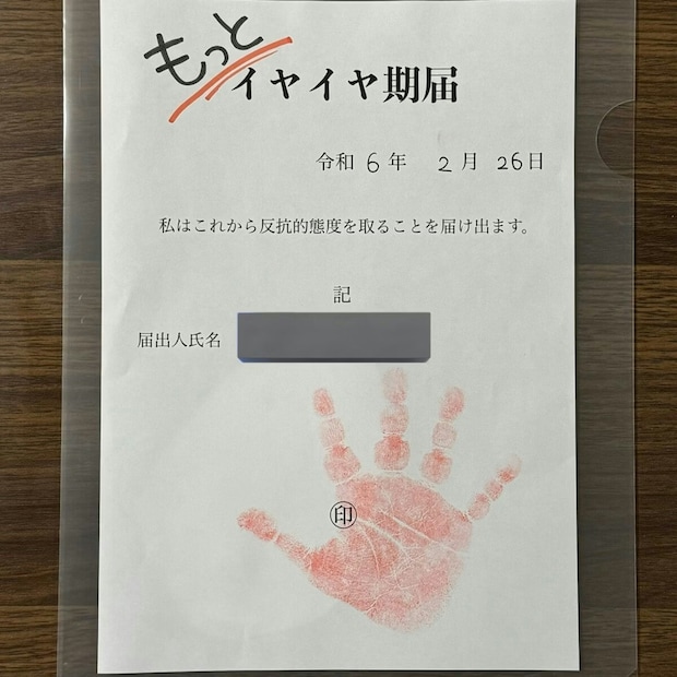 「反抗的態度を取ることを届け出ます」と書かれた、イヤイヤ期届。イヤイヤがひどくなると更新され「もっとイヤイヤ期届」へとパワーアップしました。イヤイヤ期なのにしっかりと手形は押してくれる、そんなお子さんの姿がかわいらしいですよね。イライラしてもこれが目に入るたびに「まぁ届出してるしな…」とクスっと笑えたり、少しだけ冷静になれたりしそうな気がします。